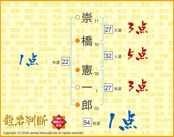 崇(11画)橋(16画) 憲(16画)一(1画)郎(10画)