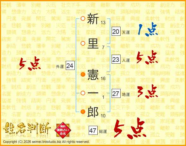 新(13画)里(7画) 憲(16画)一(1画)郎(10画)