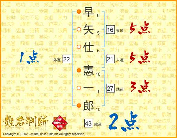 早(6画)矢(5画)仕(5画) 憲(16画)一(1画)郎(10画)