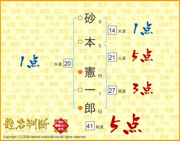 砂(9画)本(5画) 憲(16画)一(1画)郎(10画)