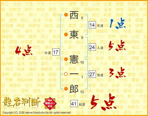 西(6画)東(8画) 憲(16画)一(1画)郎(10画)