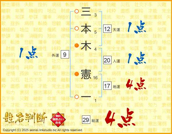 三(3画)本(5画)木(4画) 憲(16画)一(1画)