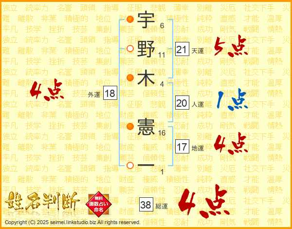 宇(6画)野(11画)木(4画) 憲(16画)一(1画)