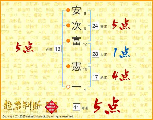 安(6画)次(6画)富(12画) 憲(16画)一(1画)