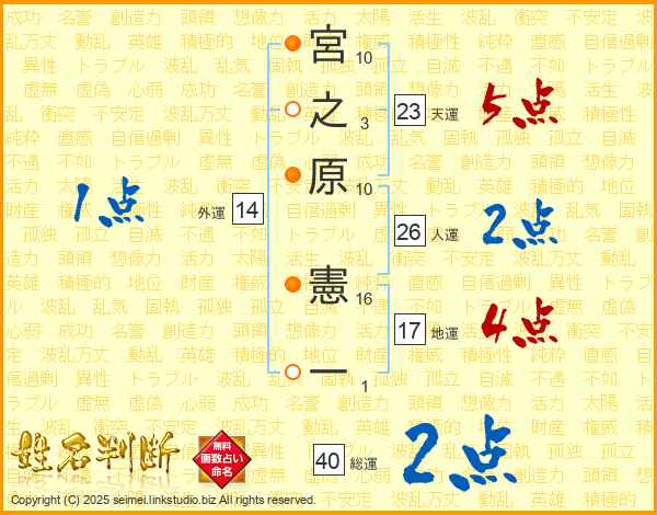宮(10画)之(3画)原(10画) 憲(16画)一(1画)