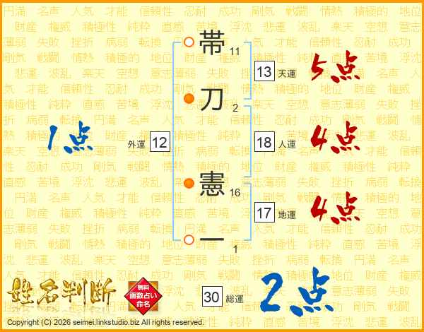 帯(11画)刀(2画) 憲(16画)一(1画)