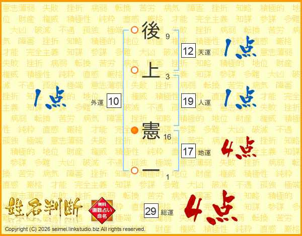 生活面を象徴する運勢です。外部から受ける影響力を表し、結婚運、家庭運や職場、環境への順応性を表します。総運から人運を引いた画数。姓や名が1文字の場合を除く。
