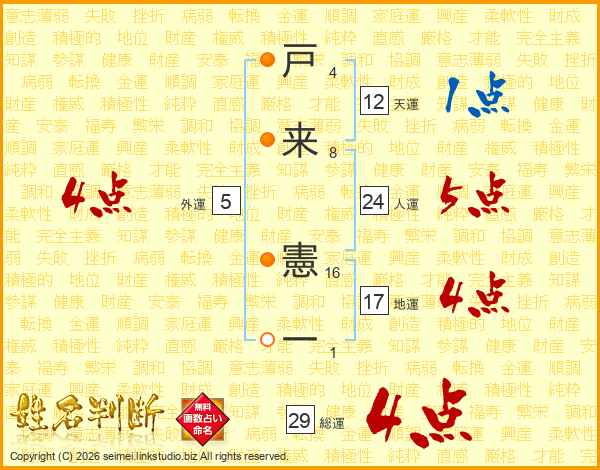 生活面を象徴する運勢です。外部から受ける影響力を表し、結婚運、家庭運や職場、環境への順応性を表します。総運から人運を引いた画数。姓や名が1文字の場合を除く。