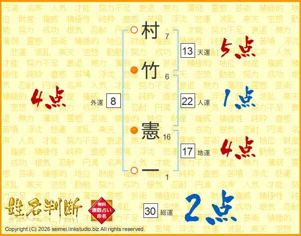 あなたの人生を表す1番重要な運勢です。生涯を通じて影響する総合運となり、主に50歳以降の晩年期に影響を及ぼします。苗字と名前の合計画数。