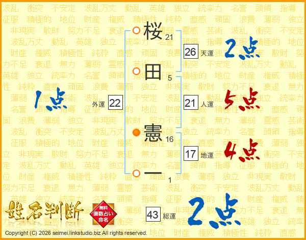 桜(21画)田(5画) 憲(16画)一(1画)