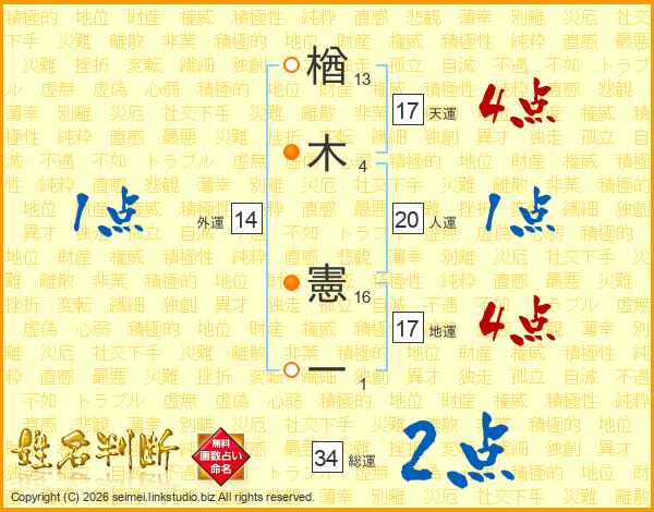 生活面を象徴する運勢です。外部から受ける影響力を表し、結婚運、家庭運や職場、環境への順応性を表します。総運から人運を引いた画数。姓や名が1文字の場合を除く。