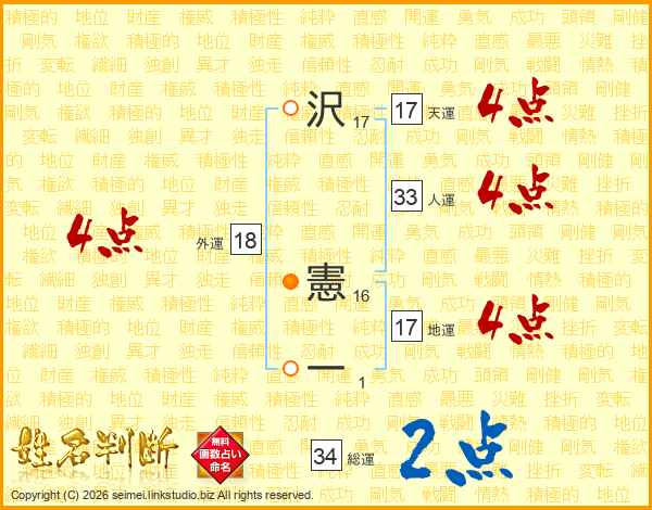 生活面を象徴する運勢です。外部から受ける影響力を表し、結婚運、家庭運や職場、環境への順応性を表します。総運から人運を引いた画数。姓や名が1文字の場合を除く。