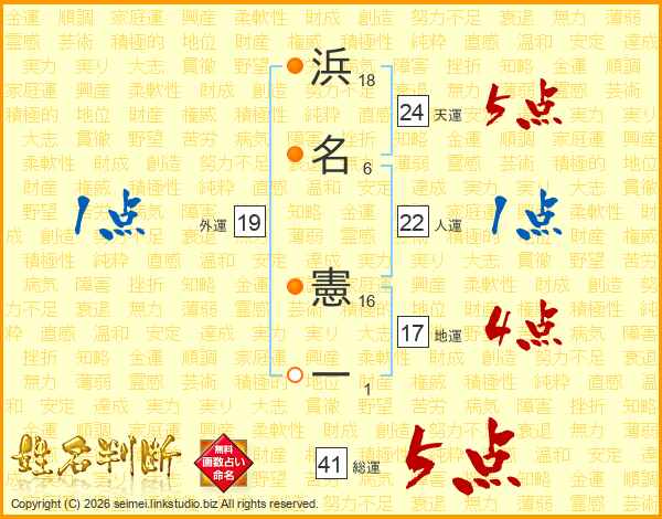 あなたの人生を表す1番重要な運勢です。生涯を通じて影響する総合運となり、主に50歳以降の晩年期に影響を及ぼします。苗字と名前の合計画数。