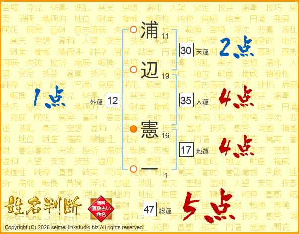 浦(11画)辺(19画) 憲(16画)一(1画)