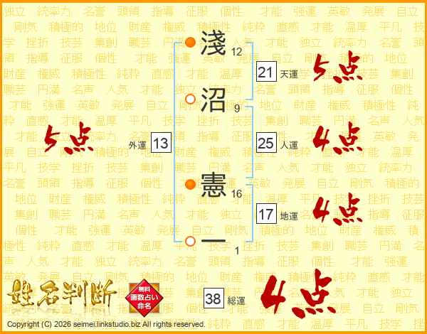 淺(12画)沼(9画) 憲(16画)一(1画)