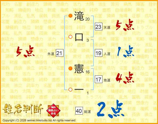 生活面を象徴する運勢です。外部から受ける影響力を表し、結婚運、家庭運や職場、環境への順応性を表します。総運から人運を引いた画数。姓や名が1文字の場合を除く。