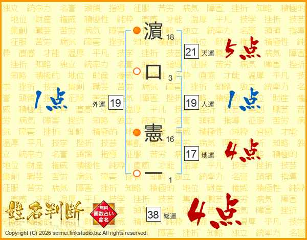 生活面を象徴する運勢です。外部から受ける影響力を表し、結婚運、家庭運や職場、環境への順応性を表します。総運から人運を引いた画数。姓や名が1文字の場合を除く。