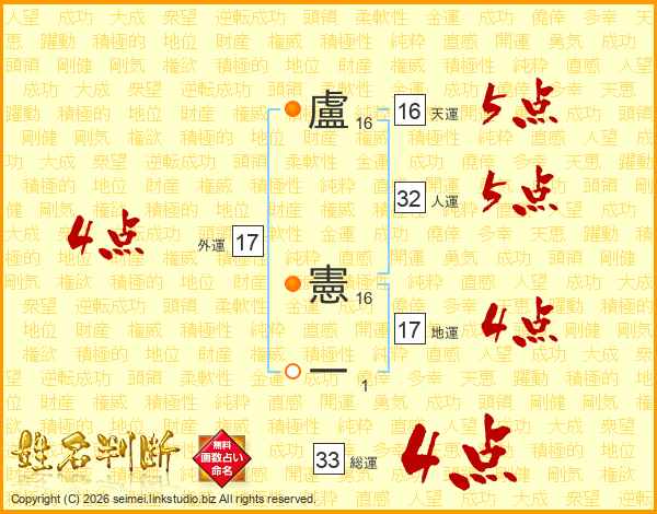 生活面を象徴する運勢です。外部から受ける影響力を表し、結婚運、家庭運や職場、環境への順応性を表します。総運から人運を引いた画数。姓や名が1文字の場合を除く。