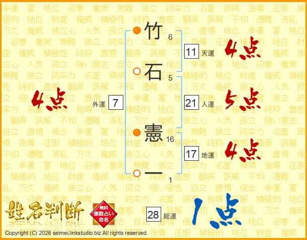 生活面を象徴する運勢です。外部から受ける影響力を表し、結婚運、家庭運や職場、環境への順応性を表します。総運から人運を引いた画数。姓や名が1文字の場合を除く。