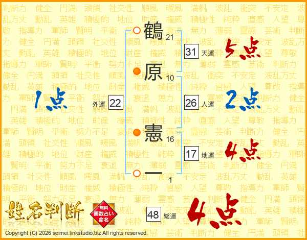 鶴原憲一さんの総運は48画の4点!