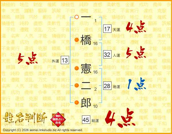一(1画)橋(16画) 憲(16画)二(2画)郎(10画)