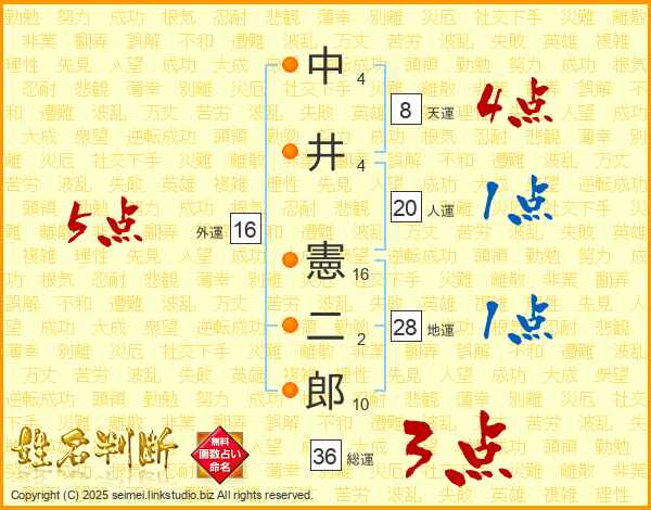 中(4画)井(4画) 憲(16画)二(2画)郎(10画)