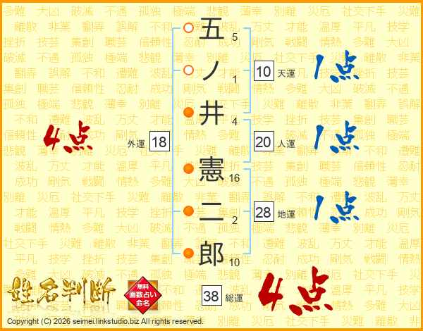五(5画)ノ(1画)井(4画) 憲(16画)二(2画)郎(10画)