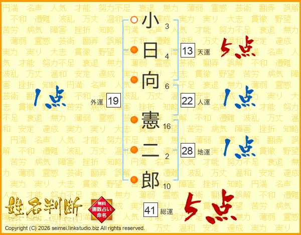小(3画)日(4画)向(6画) 憲(16画)二(2画)郎(10画)