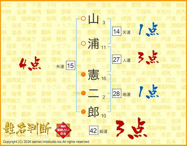 山(3画)浦(11画) 憲(16画)二(2画)郎(10画)