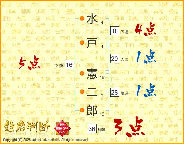 水(4画)戸(4画) 憲(16画)二(2画)郎(10画)