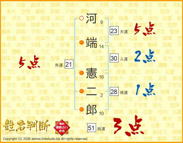 河(9画)端(14画) 憲(16画)二(2画)郎(10画)