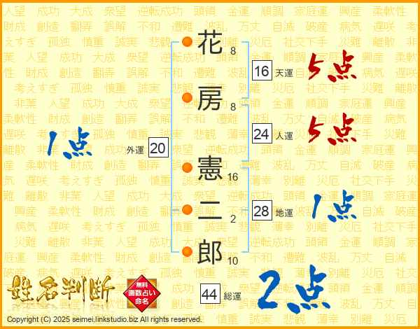 花(8画)房(8画) 憲(16画)二(2画)郎(10画)
