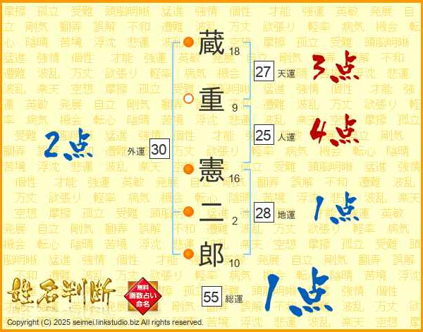 蔵(18画)重(9画) 憲(16画)二(2画)郎(10画)