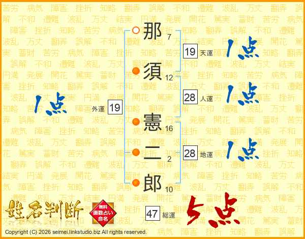 那(7画)須(12画) 憲(16画)二(2画)郎(10画)