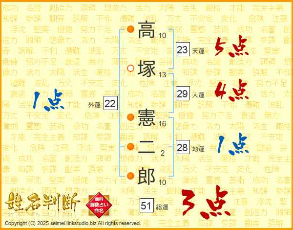 高(10画)塚(13画) 憲(16画)二(2画)郎(10画)