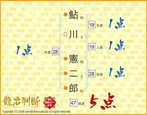 鮎川憲二郎さんの総運は47画の5点!