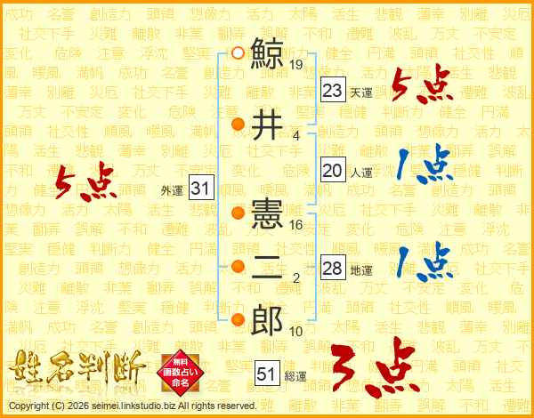 鯨(19画)井(4画) 憲(16画)二(2画)郎(10画)