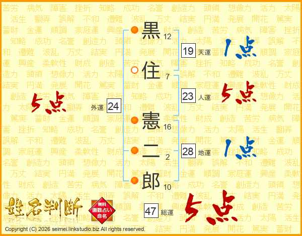 黒(12画)住(7画) 憲(16画)二(2画)郎(10画)