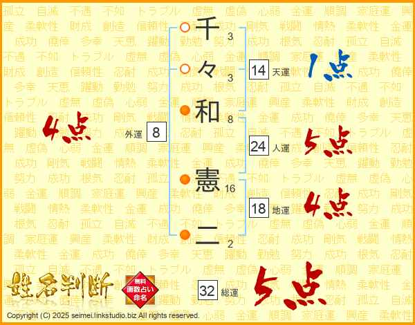 千(3画)々(3画)和(8画) 憲(16画)二(2画)