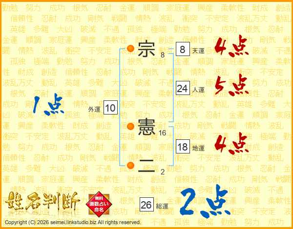あなたの人生を表す1番重要な運勢です。生涯を通じて影響する総合運となり、主に50歳以降の晩年期に影響を及ぼします。苗字と名前の合計画数。