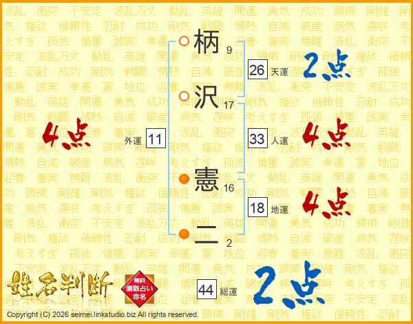 柄(9画)沢(17画) 憲(16画)二(2画)