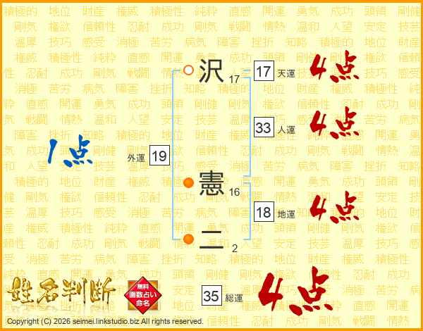 生活面を象徴する運勢です。外部から受ける影響力を表し、結婚運、家庭運や職場、環境への順応性を表します。総運から人運を引いた画数。姓や名が1文字の場合を除く。