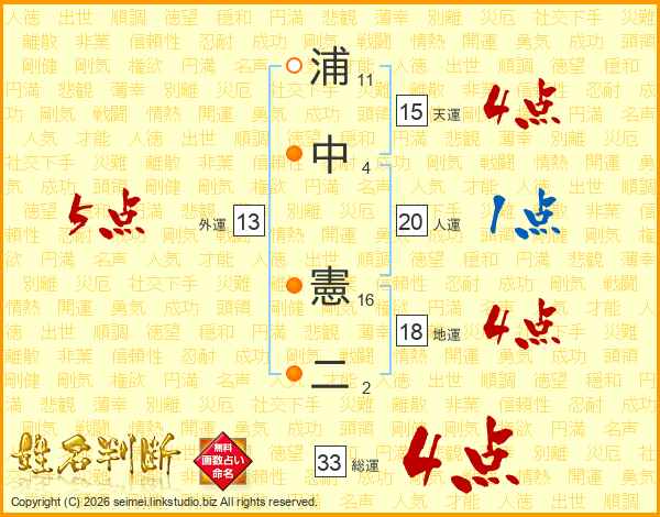 生活面を象徴する運勢です。外部から受ける影響力を表し、結婚運、家庭運や職場、環境への順応性を表します。総運から人運を引いた画数。姓や名が1文字の場合を除く。