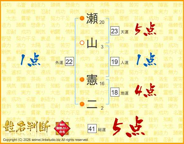 瀬山憲二さんの総運は41画の5点!