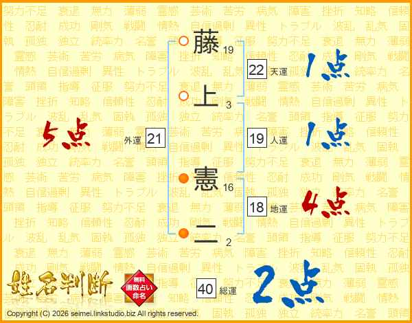 藤(19画)上(3画) 憲(16画)二(2画)