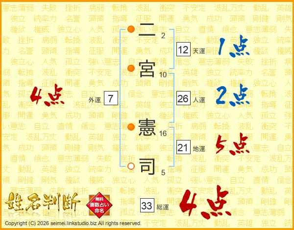 生活面を象徴する運勢です。外部から受ける影響力を表し、結婚運、家庭運や職場、環境への順応性を表します。総運から人運を引いた画数。姓や名が1文字の場合を除く。