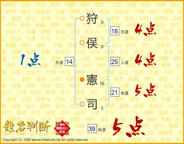 狩俣憲司さんの総運は39画の5点!