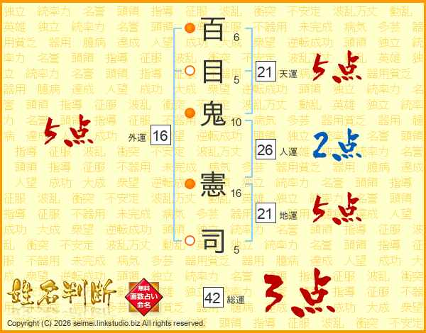 百(6画)目(5画)鬼(10画) 憲(16画)司(5画)