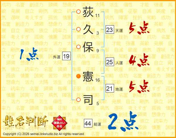 荻(11画)久(3画)保(9画) 憲(16画)司(5画)