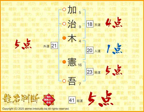 加(5画)治(9画)木(4画) 憲(16画)吾(7画)